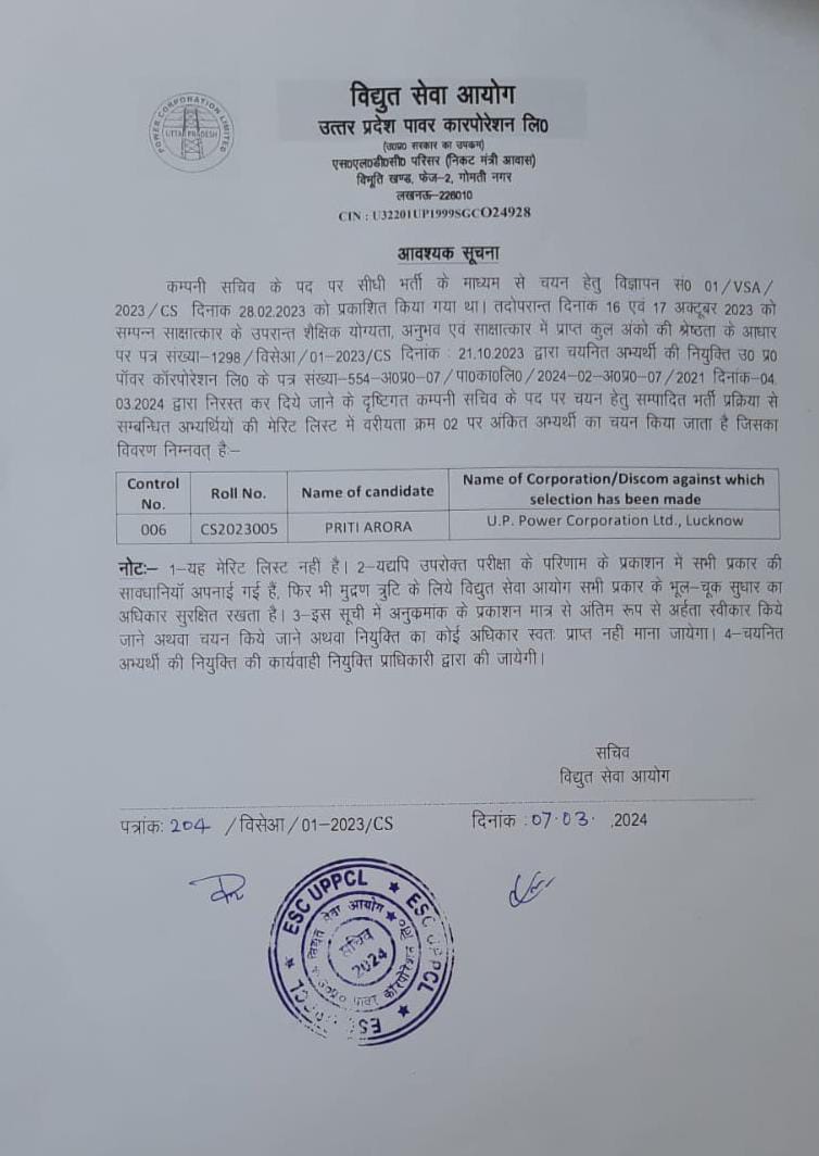 उ०प्र० पावर कारपोरेशन लि० में कम्पनी सचिव के पद पर चयन हेतु निर्गत विज्ञापन सं० 01/VSA/2023/CS के अन्तर्गत सम्पन्न साक्षात्कार के उपरान्त श्रेष्ठतानुसार चयनित अभ्यर्थी की सलग्न सूची |